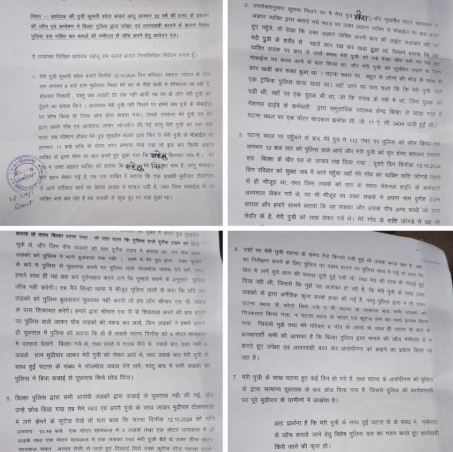 बिलासपुर,,, बिल्हा के एक गांव में एक युवती की संदिग्ध परिस्थितियों में मौत के बाद पुलिस की कार्यवाही पर गंभीर सवाल उठे हैं। मृतका के परिजनों ने पुलिस पर लापरवाही का आरोप लगाते हुए मामले में विशेष पुलिस दल से जांच की मांग की है। उन्होंने राष्ट्रीय मानवाधिकार आयोग और अन्य संबंधित अधिकारियों को भी इस मामले की जानकारी दी है।