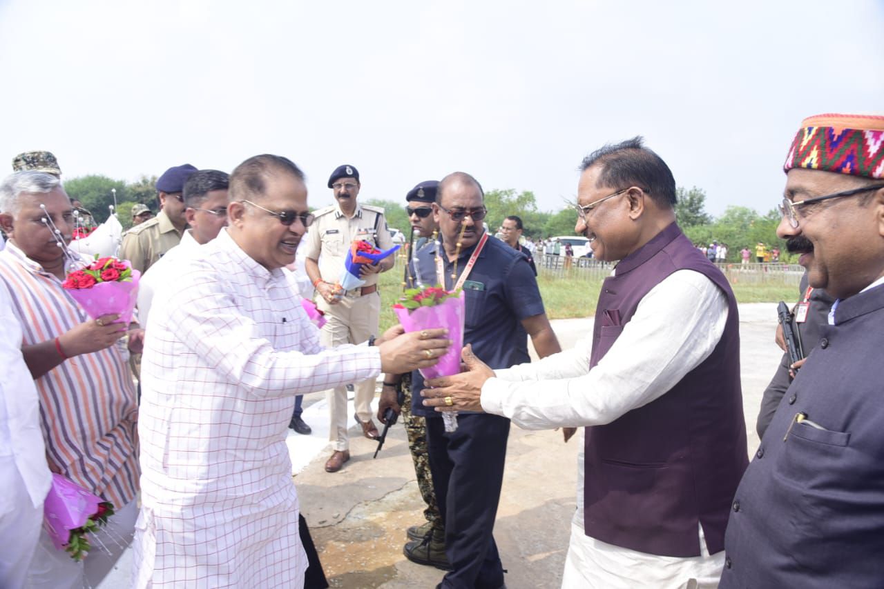 बिलासपुर,,, मुख्यमंत्री विष्णुदेव साय हेलीकॉप्टर से बिलासपुर पहुंचे। पंडित सुंदरलाल शर्मा विश्वविद्यालय हेलीपैड कोनी में उनका आत्मीय स्वागत किया गया। उप मुख्यमंत्री अरूण साव भी साथ में आए।