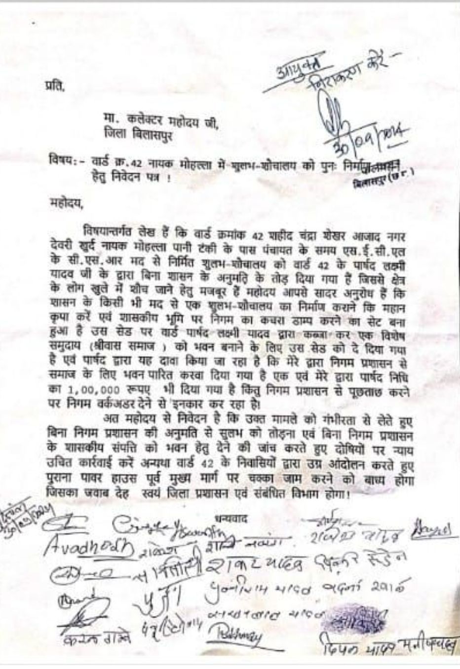बिलासपुर,,, शहर के वार्ड क्रमांक 42 के पार्षद लक्ष्मी यादव द्वारा सरकारी जमीन पर कब्जा कर अवैध निर्माण कार्य करने के मामले में तुल पकड़ लिया है! इस अवैध कब्जे पर नगर निगम की निष्क्रियता के खिलाफ अब स्थानीय युवा नेताओं और नागरिकों में आक्रोश बढ़ता जा रहा है! स्थानीय समाजसेवी और युवा कांग्रेस नेता खेत्रो महानंद ने नगर निगम प्रशासन को चेतावनी दी है! कि अगर पार्षद पर शीघ्र कार्रवाई नहीं की गई, तो वे उग्र आंदोलन करेंगे।