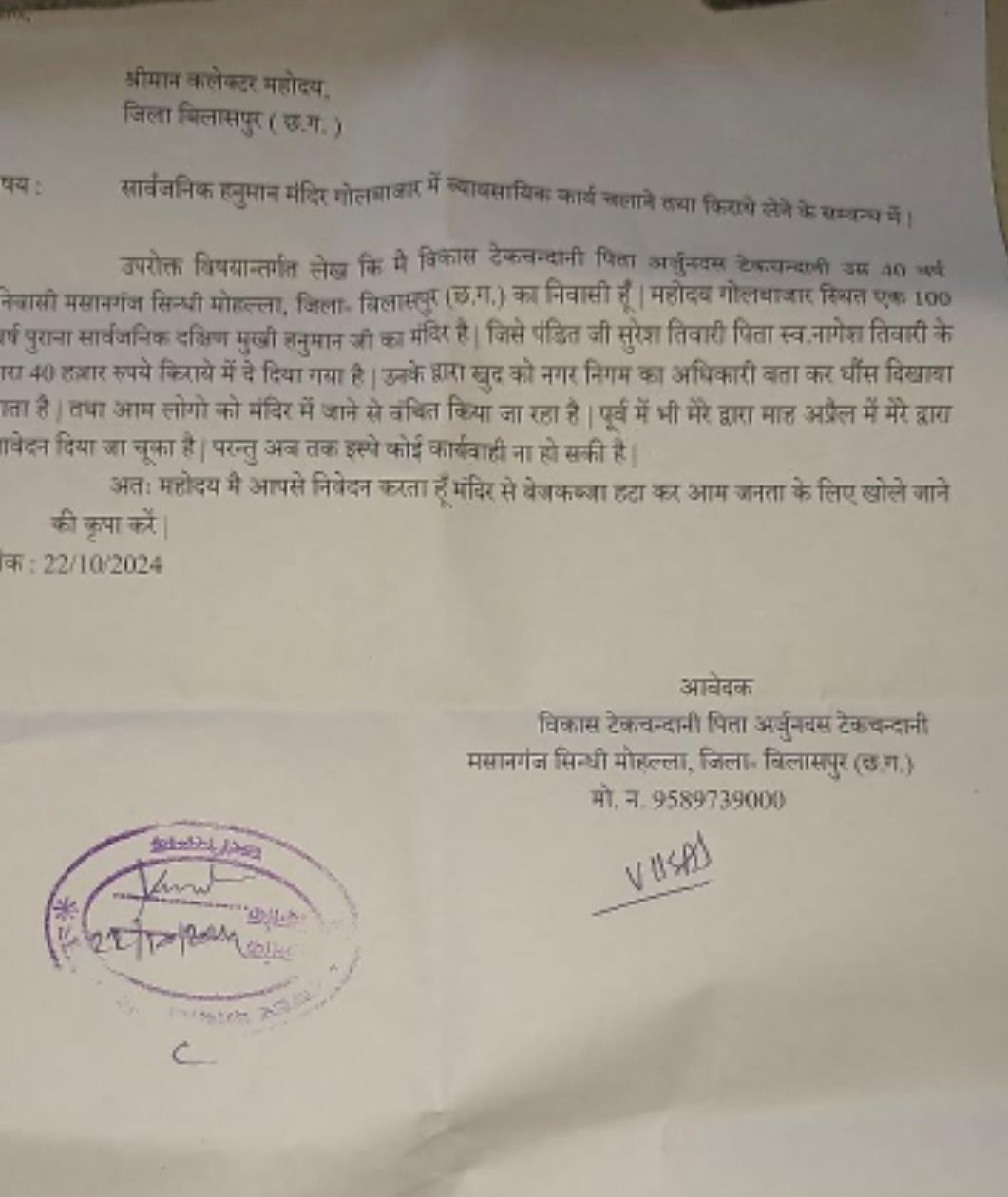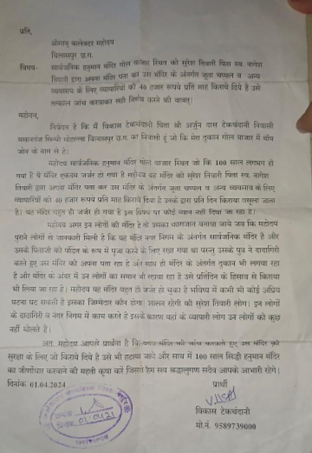 बिलासपुर,,, जिले में जमीन किराया, मकान किराया देना ये तो सभी जानते है! और सुनते आ भी रहे है! पर किसी पुजारी के द्वारा हिन्दू धर्म के देवी, देवताओ के मंदिर को किराया से देना ये आपने ना कभी देखा होगा औऱ ना कभी सुना होगा! आपको बताते चले कि शहर के बीचो बीच गोल बाजार स्थित नगर निगम के सार्वजनिक दक्षिण मुखी हनुमान मंदिर को 40 हजार रुपये महीना किराया पर देने का मामला सामने आया है! जिसकी जानकारी गोलबाजार के व्यापारी विकास टेकचंदानी सिंधी कालोनी निवासी ने इसकी शिकायत कलेक्टर से की है! वे पूर्व में भी कलेक्टर को शिकायत कर चुके थे!