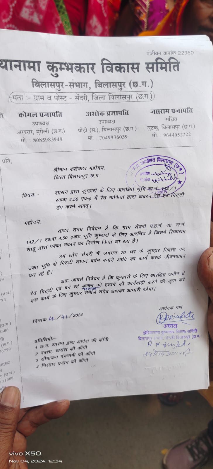 बिलासपुर,,, शासन से मिली जमीन पर कब्जा होने से 70 कुम्हार परिवारों पर आर्थिक संकट खड़ा हो गया है. सेंदरी के कूछ दबंग लोग मिट्टी खोदने कुम्हारों को मिली जमीन हथियाने अवैध निर्माण औऱ मटेरियल डंप क़र रहे है. देखे प्रभावितों कि गुहार लगाने पर कलेक्टर क्या एक्शन लेते है!