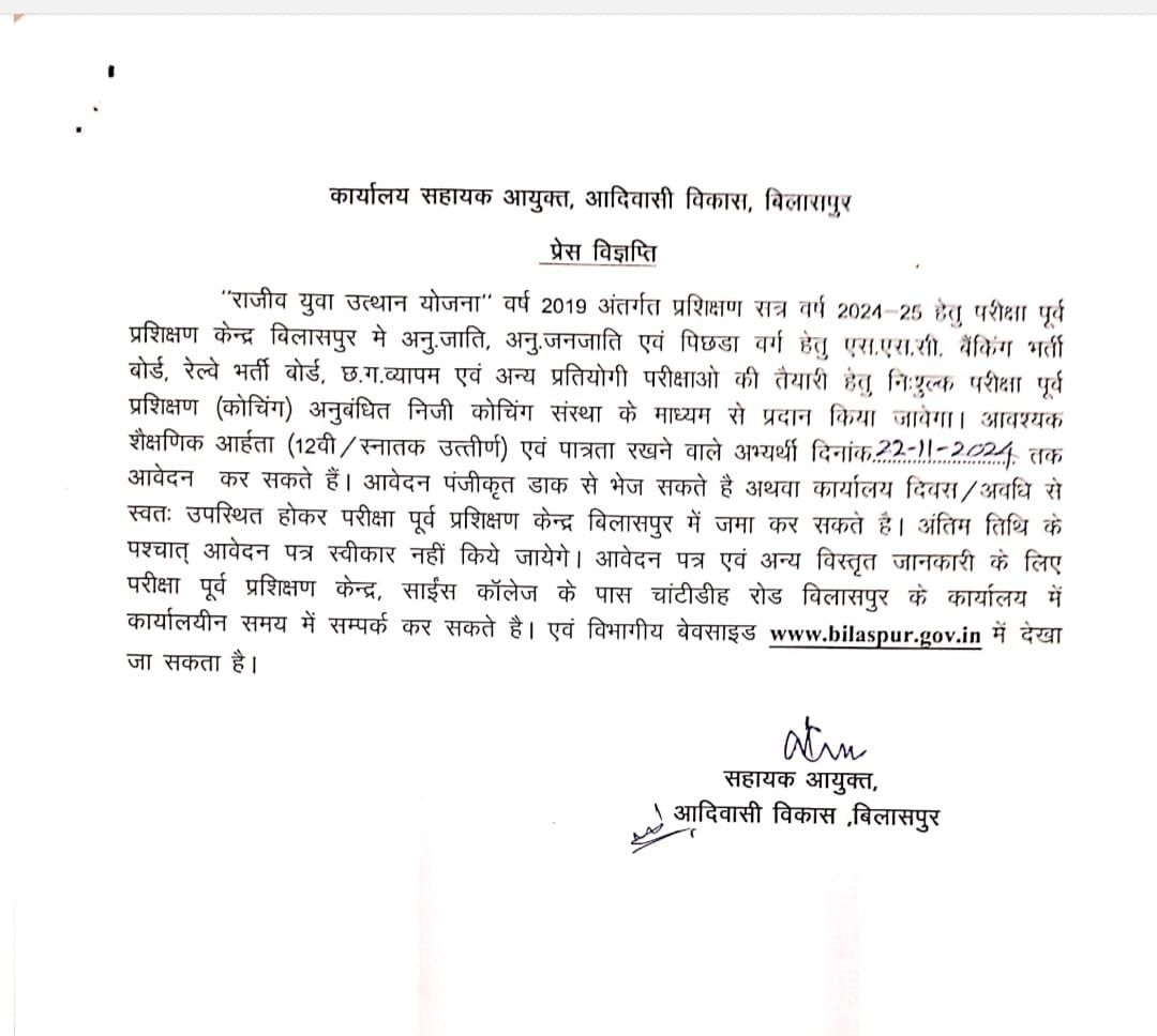 बिलासपुर,,, शासकीय नौकरी हेतु आयोजित होने वाली विभिन्न प्रतियोगी परीक्षाओं की तैयारी हेतु परीक्षा पूर्व प्रशिक्षण केन्द्र बिलासपुर मे अनु.जाति, अनु. जनजाति एवं पिछडा वर्ग के युवाओं से 22 नवंबर तक आवेदन आमंत्रित किए गए हैं। चयनित युवाओं को एस.एस.सी. बैंकिंग भर्ती बोर्ड, रेल्वे भर्ती बोर्ड, छ.ग.व्यापम एवं अन्य प्रतियोगी परीक्षाओ की निःशुल्क तैयारी करवाई जाएगी।