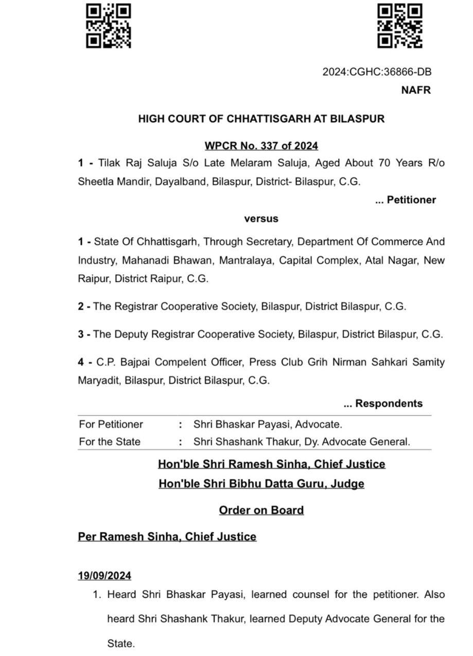 और “अस्पष्ट” करार देते हुए कहा कि याचिकाकर्ता की ओर से यह स्पष्ट नहीं किया गया कि वह किस प्रकार की राहत चाहता है! याचिकाकर्ता तिलक राज सलूजा, ने प्रेस क्लब गृह निर्माण सहकारी समिति के पूर्व अध्यक्ष इरशाद अली पर गंभीर अनियमितताओं का आरोप लगाते हुए कोर्ट में याचिका दाखिल की थी! याचिकाकर्ता ने आरोप लगाया था! कि इरशाद अली ने समिति के अध्यक्ष पद पर रहते हुए भ्रष्टाचार किया और नियमों के विपरीत भूमि आवंटन में लिप्त थे! याचिका में तिलक राज सलूजा ने समिति के अध्यक्ष के कार्यवृत्त, नए सदस्यों की सूची, और भूमि आवंटन से संबंधित प्रस्तावों की जानकारी सूचना के अधिकार (आरटीआई) अधिनियम 2005 के तहत मांगी थी! हालांकि, याचिकाकर्ता का कहना था! कि उन्हें यह जानकारी प्रदान नहीं की गई। इसके बाद उन्होंने सचिव/ पंजीयक, सहकारी समितियां, रायपुर को यह अवगत कराया कि समिति का कार्यकाल 4 फरवरी 2022 को समाप्त हो गया है! और अध्यक्ष इरशाद अली द्वारा की गई कथित गड़बड़ियों की जांच कर कार्रवाई की जाए! राज्य सरकार की ओर से याचिका का विरोध करते हुए कहा गया कि जिस व्यक्ति के खिलाफ FIR दर्ज कराने की मांग की गई है! उसे याचिका में पक्षकार नहीं बनाया गया है! सरकार की ओर से यह तर्क दिया गया कि इस आधार पर याचिका को खारिज किया जाना चाहिए!दोनों पक्षों की दलीलों को सुनने के बाद हाईकोर्ट ने अपने आदेश में कहा कि याचिकाकर्ता द्वारा दायर याचिका अस्पष्ट और अधूरी प्रतीत होती है। याचिका में यह स्पष्ट नहीं किया गया कि याचिकाकर्ता वर्तमान में किस प्रकार की राहत चाहता है। कोर्ट ने कहा कि याचिका में ठोस आधार न होने के कारण इसे खारिज किया जाता है।