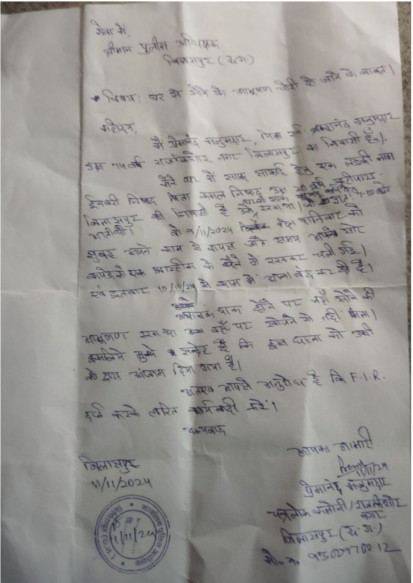 इसके बाद वे सरकंडा थाना पहुचे और नामजद शिकायत दी पर न FIR की गई न ही कार्रवाई! आवेदन लेकर चलता कर दिया! मजूमदार ने बताया SP ऑफिस से कॉल आने पर T I तोपसिंह नवरंग ने नामजद लड़की और उसकी बहन को तलब कर मंगलवार तक सामान रखे है! तो दे दो कहकर छोड़ दिया गया! बुधवार को जब वे फिर थाने गए तो आपकी लापरवाही है! कहकर उन्हें फिर से भेज दिया गया! वे बुधवार शाम तक SP साहब और सिदार साहब से मिलने फिर SP कार्यालय में डंटे रहे परन्तु दोनों से भेंट नही हो सकी! मामला मेरे संज्ञान में है! लिखित शिकायत पर उनके घर पर काम करने वाली उस लड़की को तलब कर तस्दीक की गई! शक है! कोई प्रमाण नहीं ऐसे में कैसे और किस आधार पर FIR दर्ज करे!