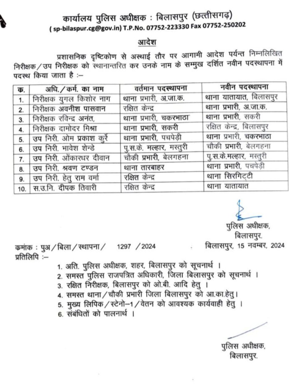 SP रजनेश सिंह के द्वारा ज्यादा तबादला आदेश के अनुसार निरीक्षक युगल किशोर नाग को अजाक से यातायात थाना भेजा गया है! चकरभाठा थाना प्रभारी रविंद्र अनंत को सकरी थाना प्रभारी बना कर भेजा गया है! पचपेड़ी थाना प्रभारी सब इंस्पेक्टर ओम प्रकाश कुर्रे को चकरभाठा थाना प्रभारी बनाया गया है! जबकि पचपेड़ी थाने में तारबाहर थाने के उपनिरीक्षक श्रवण टंडन को थाना प्रभारी बना कर भेजा गया है! उन्हें तारबाहर थाना में उत्कृष्ट प्रदर्शन एवं मामलों की त्वरित विवेचना तथा पेंडेंसी कम करने में उल्लेखनीय मेहनत करने का ईनाम मिला है! पुलिस सहायता केंद्र मल्हार के प्रभारी उप निरीक्षक भावेश शेंडे को बेलगहना चौकी प्रभारी बना कर भेजा गया है। जबकि सब इंस्पेक्टर ओंकार धर दीवान को बेलगहना से मस्तूरी थाना प्रभारी बना कर भेजा गया है!
