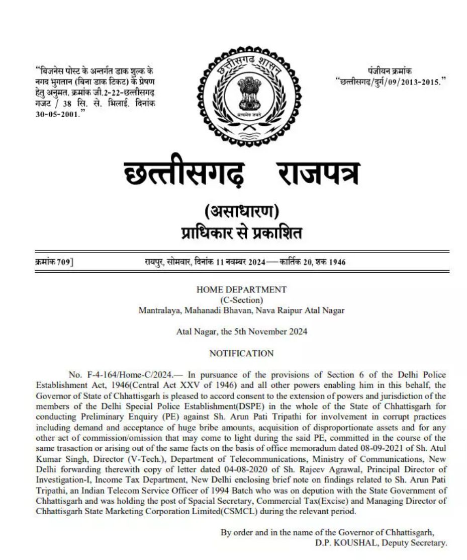 रायपुर,,, छत्तीसगढ़ में शराब घोटाला मामले की जांच अब केंद्रीय जांच एजेंसी (CBI) करेगी! साय सरकार ने इस मामले में घिरे भारतीय दूर संचार सेवा ( ITS ) के अफसर अरुण पति त्रिपाठी के खिलाफ सीबीआई जांच को मंजूरी दे दी है! बता दें कि त्रिपाठी भारतीय दूर संचार सेवा के अफसर हैं! और छत्तीसगढ़ में प्रतिनियुक्ति पर सेवाएं दे रहे थे! यहां आबकारी विभाग में विशेष सचिव रहने के दौरान उन पर बड़े पैमाने पर भ्रष्टाचार करने का आरोप है! त्रिपाठी के खिलाफ ED और ACB की जांच चल रही है! त्रिपाठी के खिलाफ झारखंड में भी शराब घोटाला का आरोप लगा है! वे अभी जगदलपुर जेल में बंद है!