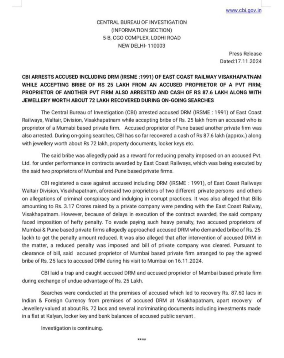 मालूम हो कि DRM सौरभ कुमार बीते दिनों ही जगदलपुर प्रवास पर पहुंचे थे! बताया जाता है! कि मुंबई व पुणे की कंपनियों पर रेलवे ने 3.17 करोड़ का जुर्माना लगाया था! जिसे कम करने DRM व कंपनी संचालकों के बीच 25 लाख की डील हुई थी! लेकिन डील के मुताबिक़ तय रकम लेते समय ही CBI ने सौरभ कुमार को रंगे हाथों पकड़ लिया!