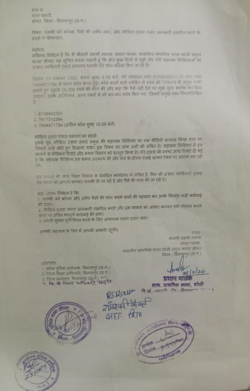 बिलासपुर,,, बिलासपुर जिले से एक बड़ी खबर सामने आ रही है! जहाँ बरेली स्कूल के प्राचार्या को मंत्रालय से फोन पर धमकी भरा कॉल आया जहाँ अब आप गर्व से कह सकते है! कि छत्तीसगढ़ में कुछ भी हो सकता है! धोखाधड़ी के शिकार लाखो गवाने के बाद जान दे रहे! और सोशल मीडिया से चर्चा में आये सीपत क्षेत्र के ग्राम बरेली के शासकीय स्कूल की प्राचार्या के पास मंत्रालय के नाम से 25 हजार रुपये की मांग को लेकर धमकी भरे कॉल आ रहे! थाने में इसकी शिकायत भी की गई है!