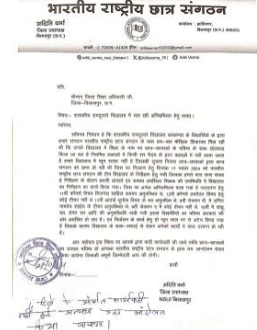एक नही दो ज्ञापन है! जिला उपाध्यक्ष अदिति वर्मा ने जहां स्कूल के प्यून के निर्वाचन ड्यूटी में जाने के कारण स्कूल की सफाई न होने से पूरे परिसर में गन्दगी फैली हुई है! अनियमितता व टीचरों के स्कूल न आने से विद्यार्थियों की पढ़ाई ठप और भविष्य अंधकार में होने और इसके बाद भी व्यवस्था न सुधरने पर उग्र आंदोलन की चेतावनी भी दी है!