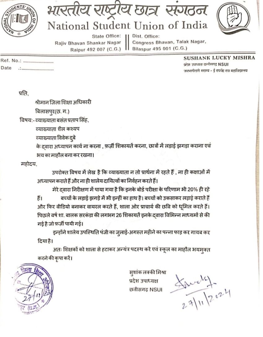 वही प्रदेश अध्यक्ष लक्की मिश्रा ने यहां के तीन शिक्षको पर बच्चों को पढ़ाने के बजाय टाइम बेटाइम स्कूल आने झूठी शिकायत और विद्यार्थियों को आपस मे लड़वा कर इनका वीडियो बना वायरल कर स्कूल की छबि खराब करने वाले ऐसे शिक्षको का अन्यत्र तबादला कर स्कूल का माहौल सुधारने की मांग की है!