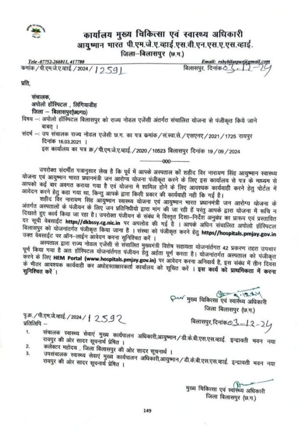 इस कारण ही इन योजनाओं को लागू नहीं किया जा रहा है! तो वही डायलिसिस की सेवा भी बंद कर दी गई है! जिसे लेकर पिछले दिनों बेलतरा विधायक सुशांत शुक्ला ने अस्पताल पहुंचकर अपनी नाराजगी जताई और दो टूक कहा कि अगर आयुष्मान योजना लागू नहीं करना है! तो फिर सरकारी जमीन छोड़कर कहीं और जाकर अस्पताल बनाएं! अब इस मामले में CMHO डॉक्टर अनिल श्रीवास्तव ने भी अपोलो को नोटिस जारी कर 7 दिनों के भीतर पंजीकरण की जानकारी देने के निर्देश दिए हैं! वर्तमान में आयुष्मान भारत योजना के तहत पात्र लाभार्थियों को 5 लाख रुपये तक का मुफ्त इलाज दिया जाता है! अब 70 वर्ष से अधिक के बुजुर्गों को भी इसका लाभ मिल रहा है! योजना के तहत गरीब और वंचित परिवार को बेहतर स्वास्थ्य सुविधाएं उपलब्ध कराना है! बिलासपुर में ऐसी बहुत सारी बीमारियां हैं! जिनका इलाज अपोलो में ही होता है! लेकिन अपोलो में आयुष्मान कार्ड नहीं चलने से गरीब इलाज से वंचित हो रहे हैं! जिसके बाद यह कदम उठाया गया है! जनप्रतिनिधियों ने भी इस कदम का समर्थन किया है!