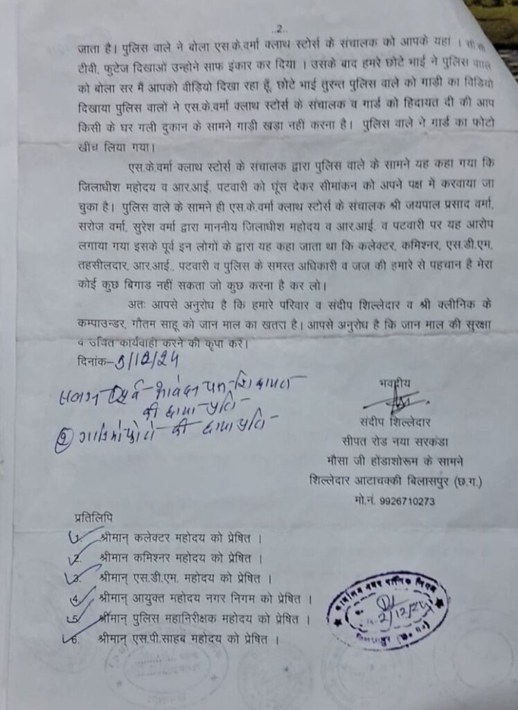बिलासपुर,,, नया सरकंडा सीपत रोड सिल्लेदार आटा चक्की के संचालक विगत 3 साल से कलेक्टर, एसपी, एसडीएम के समक्ष लगातार गुहार लगा रहे पर कोई सुनवाई नही हो रही! उनका आरोप है! कि उनके घर के सामने और गली में वर्मा क्लॉथ स्टोर्स के संचालक द्वारा अवैध पार्किंग करने व कराने और मना करने पर जान से मारने व घर गली को कब्जा करने की दी जा रही धमकी का है!