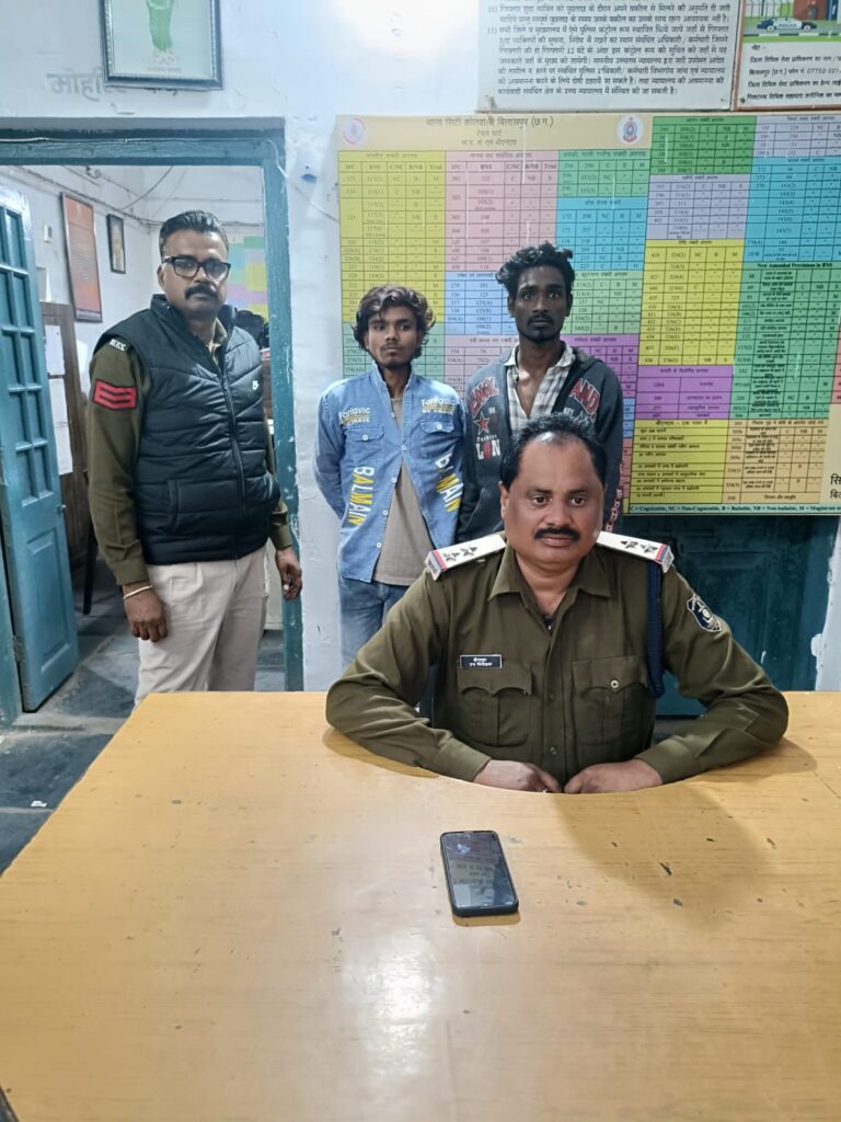 बिलासपुर,,, प्रथिया द्वारा थाना कोतवाली में रिपोर्ट दर्ज कराया की प्रार्थिया के शिशू भवन से अपने काम से घर वापस जाते समय रात्रि करीबन 09.18 बजे बालाजी निवास पचरी घाट के पास पहुंची थी कि अपनी मोबाईल फोन विवो कंपनी से बात करते चल रही तभी पीछे से एक मोटर सायकल सवार दो व्यक्ति आकर मोबाईल फोर को झप्पटा मारकर लेकर भाग गये थे कि रिर्पोट पर थाना सिटी कोतवाली में अप.क्र. 600 / 24 धारा 304, 3 ( 5 ) बीएनएस दिनांक 12.12.24 को कायम कर विवेचना में लिया था। प्रकरण की गंभीरता को देखते हुए इसकी सूचना श्रीमान पुलिस अधीक्षक महोदय श्री रजनेश सिंह (भा.पु.से.), अति पुलिस अधीक्षक (शहर) श्री राजेन्द्र जायसवाल एवं नगर पुलिस अधीक्षक श्री अक्षय प्रमोद साबद्रा (भा.पु.से.) को अवगत कराया गया जिनके द्वारा तत्काल कार्यवाही करने के निर्देश पर थाना सिटी कोतवाली पुलिस द्वारा मुखबीर सूचना, सीसीटीवी फुटेज के आधार पर त्वरित कार्यवाही करते हुए दबिश देकर आरोपियों को चिंगराज पारा सरकंडा से 01. – नंद लाल साहू उर्फ नंदू पिता हेम लाल उम्र 22 वर्ष निवासी राजीव नगर चिंगराजपारा थाना सरकण्डा बिलासपुर छ. ग. | 02 – रोमित यादव पिता पंचू यादव उम्र 21 वर्ष निवासी चिंगराज पारा थाना सरकण्डा बिलासपुर छ.ग. को पकडा गया है , छीना हुआ मोबाइल जप्त कर आरोपीयो को गिरफ्तार कर न्यायिक रिमाण्ड पर जेल भेजा गया है। –