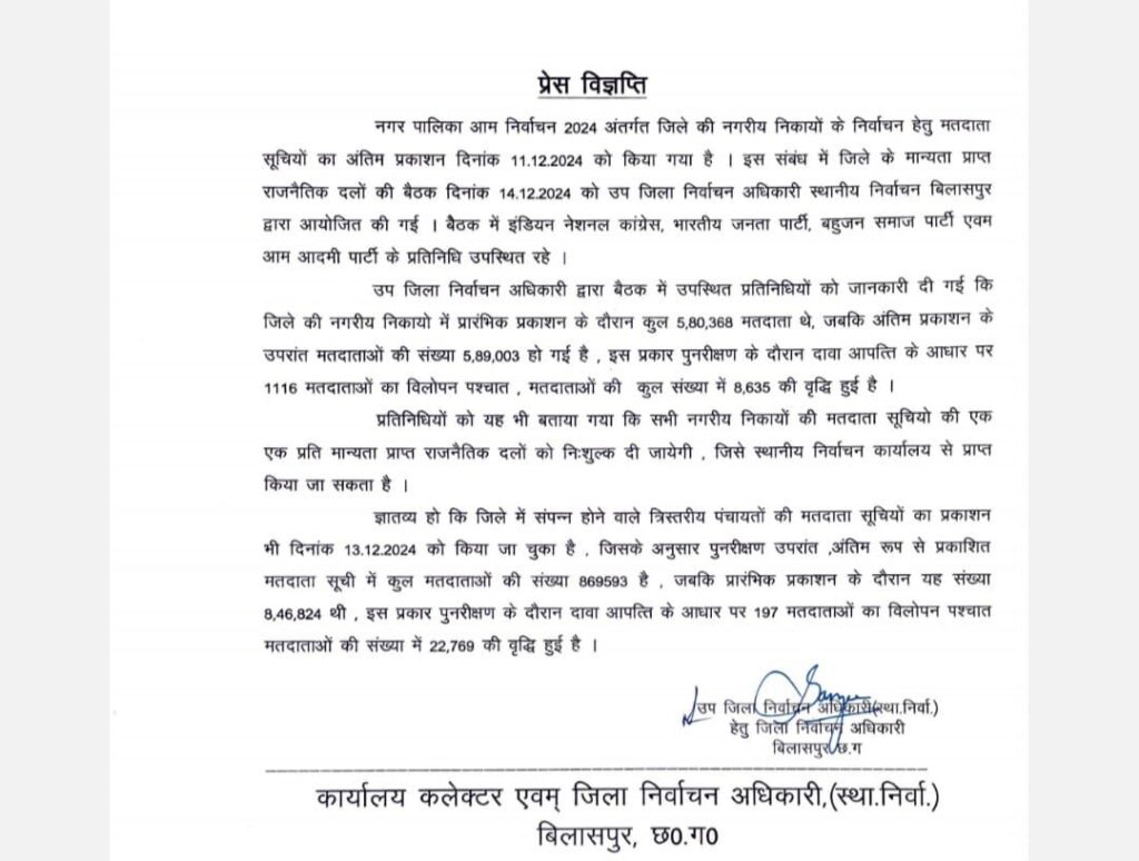 उप जिला निर्वाचन अधिकारी द्वारा बैठक में उपस्थित प्रतिनिधियों को जानकारी दी गई! कि जिले की नगरीय निकायो में प्रारंभिक प्रकाशन के दौरान कुल 5,80,368 मतदाता थे! जबकि अंतिम प्रकाशन के उपरांत मतदाताओं की संख्या बढ़कर 5,89,003 हो गई है! अंतिम प्रकाशन 11 दिसंबर को किया गया! इस प्रकार पुनरीक्षण के दौरान दावा आपत्ति के आधार पर 1116 मतदाताओं का नाम विलोपितकिया गया। इसके उपरांत मतदाताओं की कुल संख्या में 8,635 की वृद्धि हुई है! बैठक में यह भी बताया गया कि सभी नगरीय निकायों की मतदाता सूचियो की एक एक प्रति मान्यता प्राप्त राजनैतिक दलों को निःशुल्क दी जायेगी! जिसे स्थानीय निर्वाचन कार्यालय से प्राप्त किया जा सकता है!