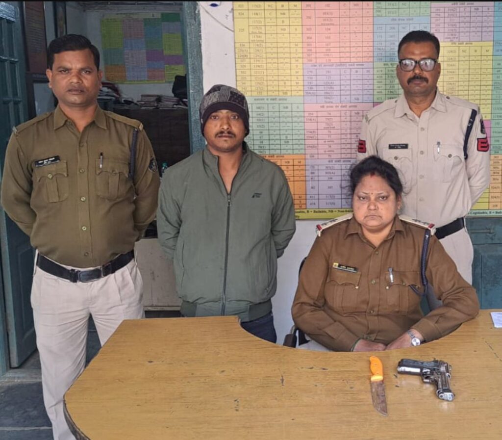 बिलासपुर,,,पुलिस अधीक्षक रजनेश सिंह के द्वारा जिले में हो रहे बढ़ते अपराध पर नियंत्रण रखने पुलिस ने लगातार अपराधियो पर कड़ी कार्यवाही के निर्देश दिए! जिसमे कोतवाली पुलिस को मुखबिर से सूचना मिली कि कतियापारा संतोषी मंदिर का रहने वाला आरोपी सुमित वर्मा के पास स्टील का धारदार चाकू और स्टील का प्लास्टिक का पिस्टल नुमा दिखने वाला लाइटर को लेकर आने-जाने वालो को डरा धमका रहा है! जिसमे आने जाने वाले भयभीत हो रहे थे! जिसकी सूचना सिटी कोतवाली थाने में दी गई! जिस पर पुलिस अधीक्षक रजनेश सिंह (भा.पु.से.), अति. पुलिस अधीक्षक (शहर) राजेन्द्र जायसवाल एवं नगर पुलिस अधीक्षक अक्षय प्रमोद साबद्रा (भा.पु.से.) को अवगत कराया गया! जिनके द्वारा तत्काल कार्यवाही करने के निर्देश पर थाना सिटी कोतवाली पुलिस द्वारा दबिश देकर आरोपी – सुमित वर्मा पिता मित लाल वर्मा उम्र 29 वर्ष निवासी संतोषी मंदिर के पास कतियापारा जुना बिलासपुर थाना सिटी कोतवाली जिला बिलासपुर को कतियापारा से पकडा गया! जिसके पास से एक धारदार चाकू एवं स्टील प्लास्टि का पिस्टल नुमा दिखने वाला लाईटर मिला जिसके संबंध में धारा 94 B .N.S.S. के नोटिस दस्तावेज पेश करने हेतु दिया गया! जो नोटिस पर कोई दस्तावेज नहीं होना बताये जाने पर आरोपी का कृत्य अपराध धारा 25, 27 आर्म्स एक्ट का घटित करना पाये जाने से आरोपी के विरूद्ध अप.क्र. – 608 / 24 धारा 25, 27 आर्म्स एक्ट के तहत आरोपी को गिरफ्तार कर न्यायिक रिमाण्ड पर जेल भेजा गया है!
