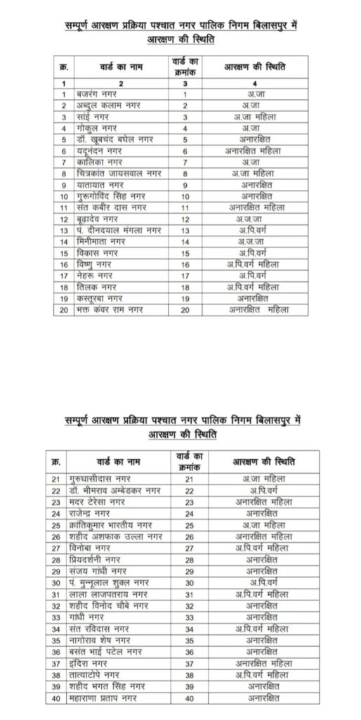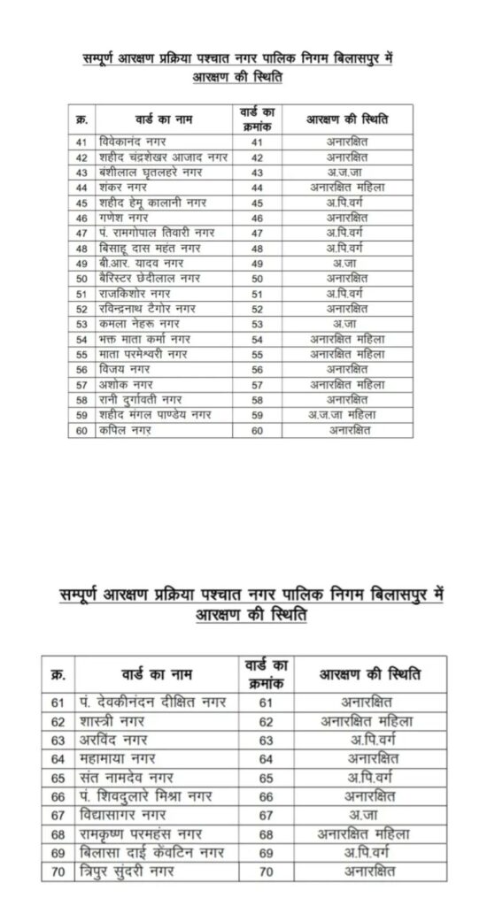 चुनाव में पारदर्शिता और सामाजिक न्याय को प्राथमिकता देते हुए आरक्षण प्रक्रिया तय मानकों के तहत संपन्न की गई! बिलासपुर के सभी 70 वार्डों को वर्गीकृत किया गया है! जिसमें कुछ वार्ड सामान्य वर्ग के लिए और कुछ O.B.C. S.C. तथा S.C. वर्गों के लिए आरक्षित किए गए हैं!