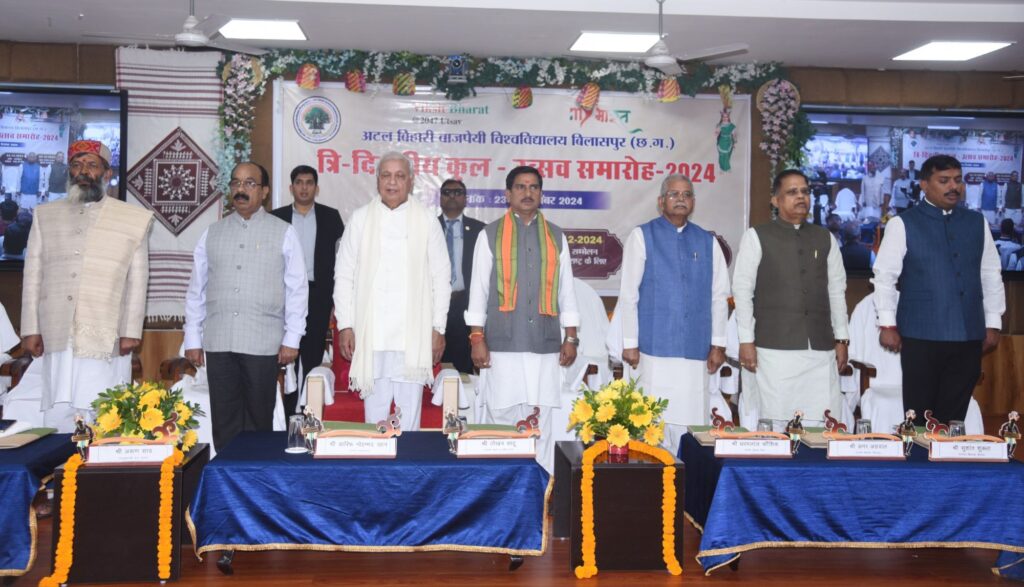 राज्यपाल खान ने विश्वविद्यालय परिसर में पौधा भी लगाया! इस अवसर पर विश्वविद्यालय की त्रैमासिक पत्रिका ‘कन्हार’ के नये अंक सहित विभिन्न प्रकाशनों का विमोचन भी किया! केंद्रीय आवासन एवं शहरी विकास राज्यमंत्री तोखन साहू ने समारोह की अध्यक्षता की! इस अवसर पर उपमुख्यमंत्री अरुण साव अतिविशिष्ट अतिथि के रूप में शामिल हुए! विधायक बिलासपुर अमर अग्रवाल, बिल्हा विधायक धरम लाल कौशिक, बेलतरा विधायक सुशांत शुक्ला , कुलपति आचार्य अरूण दीवाकर नाथ वाजपेयी एवं जिला पंचायत अध्यक्ष अरूण सिंह चौहान उपस्थित थे!