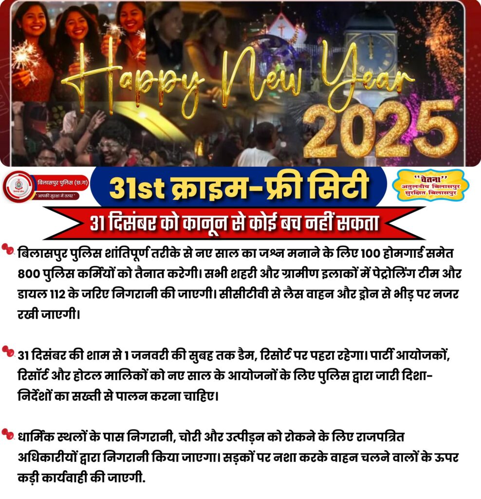 बिलासपुर,,, नए साल के मौके पर शहर में सुरक्षा और व्यवस्था बनाए रखने के लिए पुलिस ने विशेष तैयारी की है! इस अवसर पर शहरवासियों को सुरक्षित और शांतिपूर्ण तरीके से जश्न मनाने के लिए दिशा-निर्देश जारी किए गए हैं! पुलिस विभाग ने सोशल मीडिया के जरिए एक पोस्टर जारी किया, जिसमें प्रमुख निर्देश दिए गए हैं!