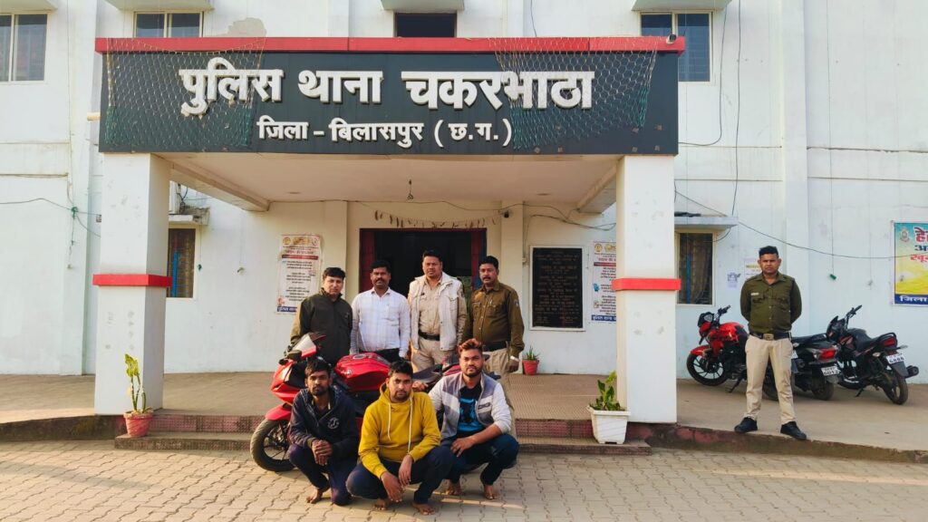 बिलासपुर,,, राजूदास मानिकपुरी पिता स्व. श्रवणदास मानिकपुरी उम्र 45 वर्ष निवासी कीर्ति नगर तिफरा थाना सिरगिट्टी बिलासपुर के द्वारा रिपोर्ट दर्ज कराया कि दिनांक 21.11 2024 के शाम 06.00 अपने मोटर सायकल यामहा R15 क्रमांक CG 10 BV 7975 से अपने गांव ग्राम कड़ार तालाब के पास गया था जहां ज्यादा नशा होने के कारण अपने घर ना जाकर अपना मोटर सायकल को वही तालाब के पास खड़ी कर सो गया था कुछ देर बाद उठा तो देखा प्रार्थी का मोटर सायकल वहां नही था आसपास अपने मोटर सायकल यामहा का पता तलाश किया नहीं मिला मोटर सायकल यामहा R15 क्रमांक CG 10 BV 7975 कीमती करीबन 02 लाख रुपए को कोई अज्ञात चोर चोरी कर ले गया है, कि रिपोर्ट पर थाना चकरभांठा में उक्त प्रकरण पंजीबद्ध कर विवेचना किया गया दौरान विवेचना जरिये मुखबीर से सूचना प्राप्त हुई कि उक्त मोटर सायकल सिलतरा में काम करने वाला एक व्यक्ति रखकर चला रहा है, सूचना पर वरिष्ठ अधिकारियों से निर्देशन एवं मार्गदर्शन प्राप्त कर दबिश दिया गया जो उस व्यक्ति के कब्जे से मोटर सायकल मिला जिसे एवं उनके साथियो को थाना लाकर पुछताछ किया गया आरोपी आशिष उर्फ गोल्डी तथा प्रकाश यादव दोनो निवासी ग्राम टेकारी मस्तूरी द्वारा दिनांक 21.11.2024 को शाम घटना स्थल से मोटर सायकल चोरी करना तथा खेमचंद उर्फ राहुल दिनकर निवासी कुरेली बिल्हा के पास बिक्री करना बताये। आरोपी खेमचंद्र उर्फ राहुल दिनकर के कब्जे से मोेटर यामहा R15 क्रमांक CG 10 BV 7975 कीमती करीबन 02 लाख रूपये को जप्त कर तीनों आरोपीयों को विधिवत गिरफ्तार कर माननीय न्यायालय के समक्ष पेश किया गया है।