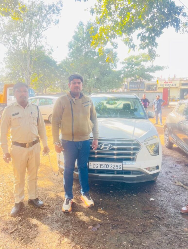 जिस पर आरोपी अभय नायडू को गिरफ्तार कर उसके कब्जे से क्रेटा वाहन क्रमांक सी जी/15/डी एक्स/3296 कीमती लगभग 15,00,000/- रूपये जप्त कर आरोपी के विरूद्ध कार्यवाही किया गया।