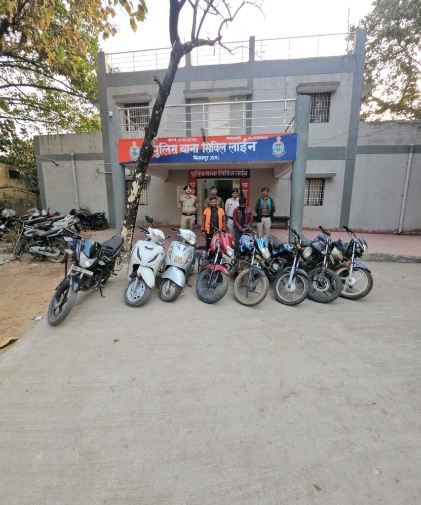 बिलासपुर,,, मामले का संक्षिप्त विवरण इस प्रकार है कि शहर मे लगातार हो रही बाईक चोरियो पर अंकुश लगाने एवं बाईक चोरो का पता करने पुलिस अधीक्षक द्वारा निर्देशित किया गया था कि श्रीमान् अतिरिक्त पुलिस अधीक्षक (शहर) राजेन्द्र जायसवाल नगर पुलिस अधीक्षक निमितेश सिंह के मार्गदर्शन मे विशेष टीम का गठन कर अपराध पतासाजी चोरो व चोरी गए घटना स्थल मे पुलिस टीम के द्वारा लगातार सीसीटीव्ही फुटेज का अवलोकन, मुखबिरो को अलर्ट मे रखकर विशेष रूप से निर्देर्शित किया गया जिसके फलस्वरूप पुलिस टीम को मुखबिर द्वारा सूचना मिला कि चोर मोटर सायकल मे नंबर प्लेट बदलकर उपयोग कर रहे है व चोरी के मोटर सायकलो को बेचने के फिराक मे ग्राहक की तलाश कर रहे है जिसमें पुलिस ने चोरो की पहचान कर घेराबंदी कर पकडने मे सफलता प्राप्त की, आरोपी संदीप डहरिया से 01 नग मोटर सायकल एवं आरोपी अरविन्द दिवाकर से कुल 07 स्कूटी एवं मोटर सायकल बरामद की गयी चोरो द्वारा 06 नग मोटर सायकल को उस्लापुर रेल्वे स्टेशन के पार्किंग में बिकी करने के लिए छुपाकर रखा गया था, जिसे बेचने के लिए ग्राहक की तलाश कर रहे थे। बिलासपुर पुलिस द्वारा चोरी किए गए स्कूटी एवं मोटर सायकल को जप्त करने मे सफलता हासिल हुयी ।