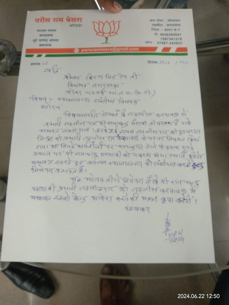 मीडिया के द्वारा इस संबंध में सच्चाई का पता करने बस्तर जिले के स्थानीय पत्रकारों से संपर्क किया गया! जिसमें यह बात निकाल कर सामने आई है! कि सुकमा भाजपा अनुसूचित जाति मोर्चा के प्रदेश कार्यकारी सदस्य बनवासी मौर्य एवं पूर्व जनपद अध्यक्ष परीसराम बेसरा ने बाकायदा पत्र लिखकर जिले के प्रभारी मंत्री टंक राम वर्मा से शिकायत की है!